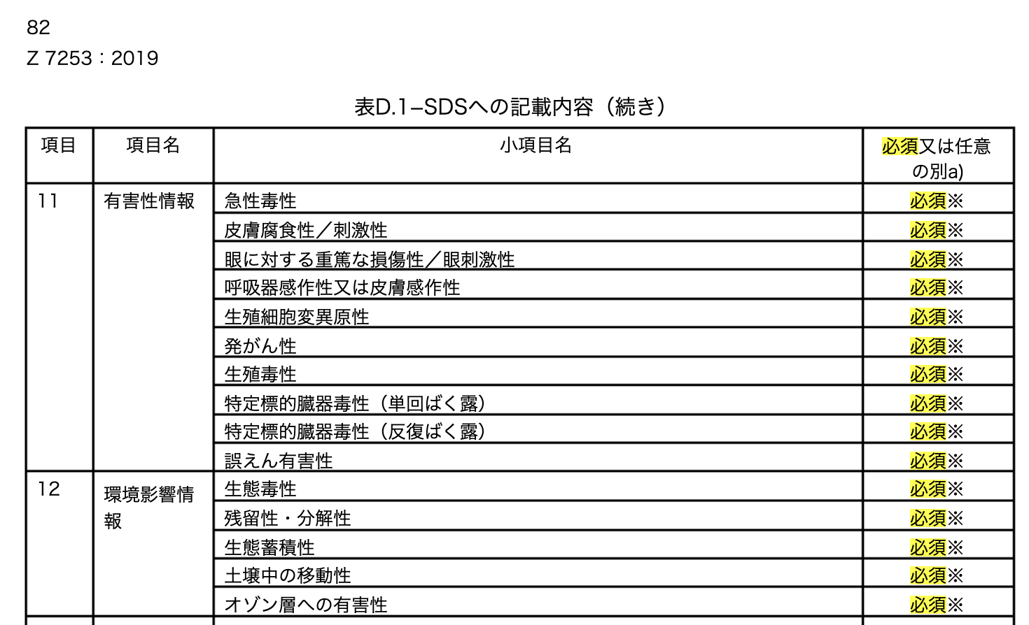SDSの11項「有害性情報」において、特定標的臓器毒性(単回ばく露・反復ばく露)に該当情報がない場合でも、「情報なし」と明記する必要がありますか? 2025年10月21日 16:09 更新 あります。JIS Z 7253では、特定標的臓器毒性の記載が必須とされており、仮に該当情報がない場合に項目そのものを省略するのではなく、情報・データがない場合はその旨を記載すべき、と規定されています。 スクリーンショット 2025-10-22 1.06.52.png 200 KB ダウンロード 関連記事 SDS作成時にGHS分類の計算を行った際、その分類根拠データを出力することはできますか?