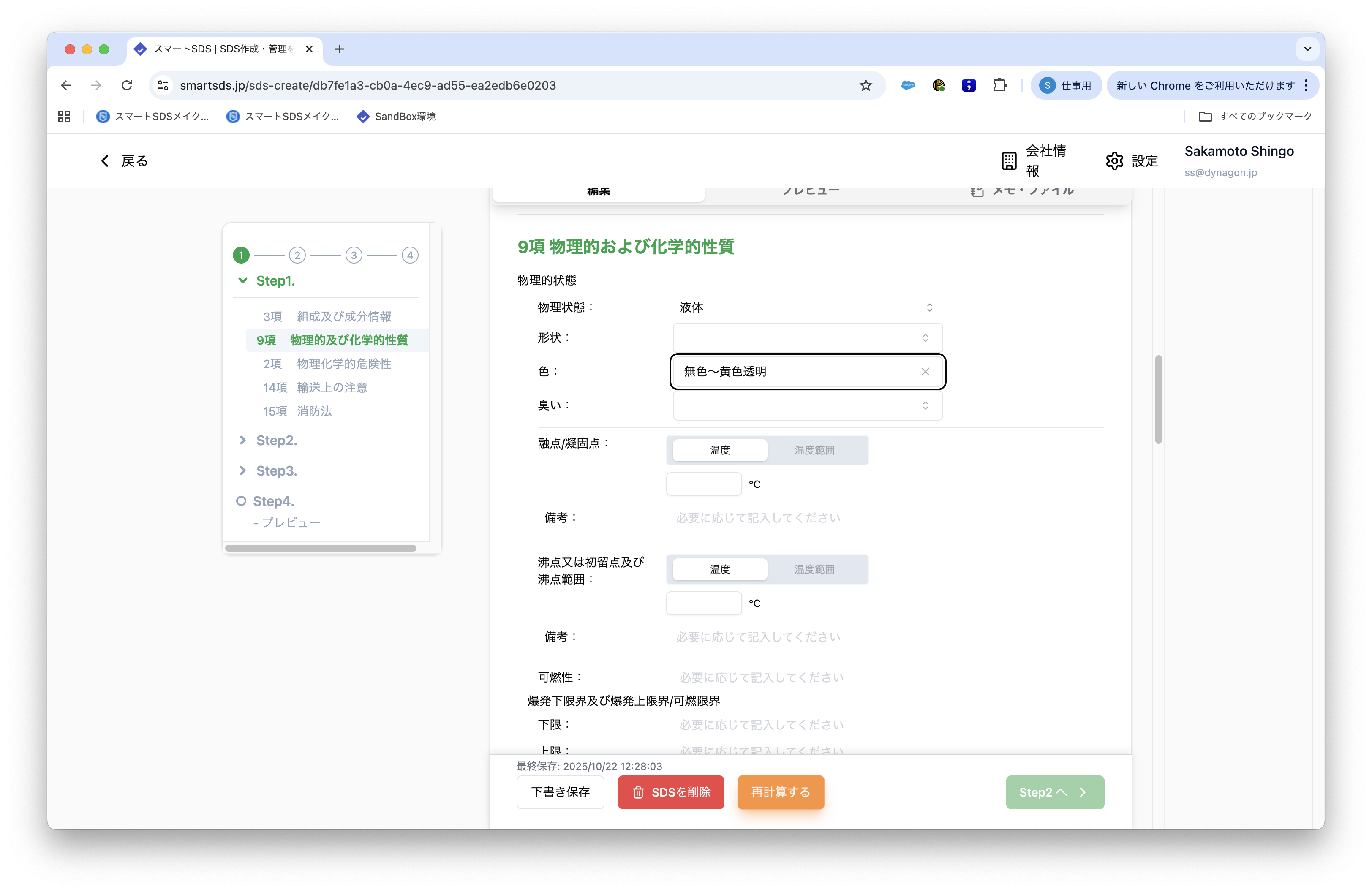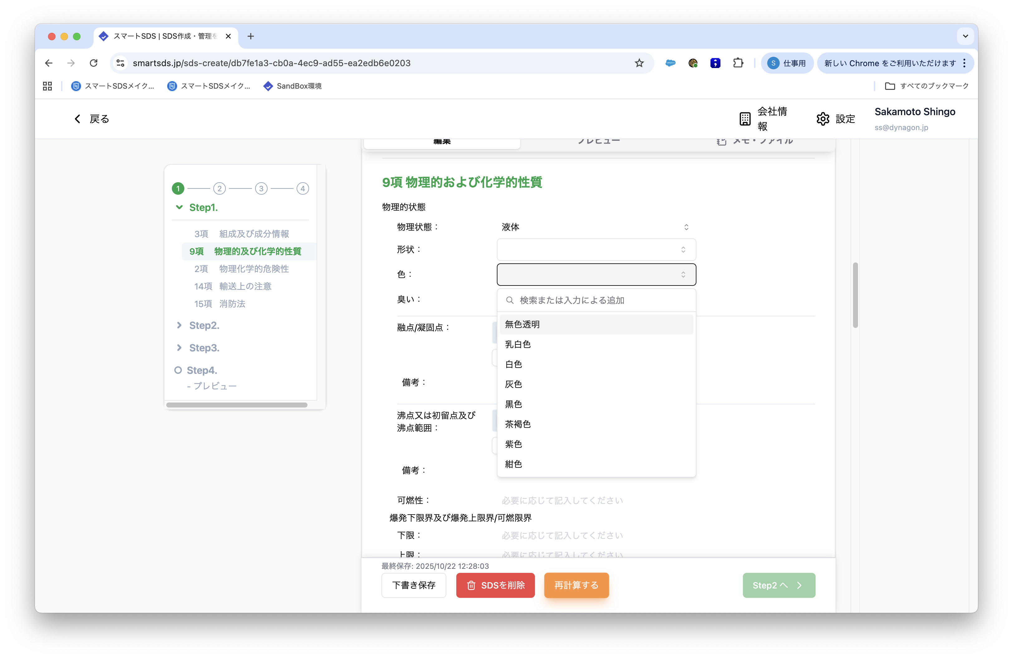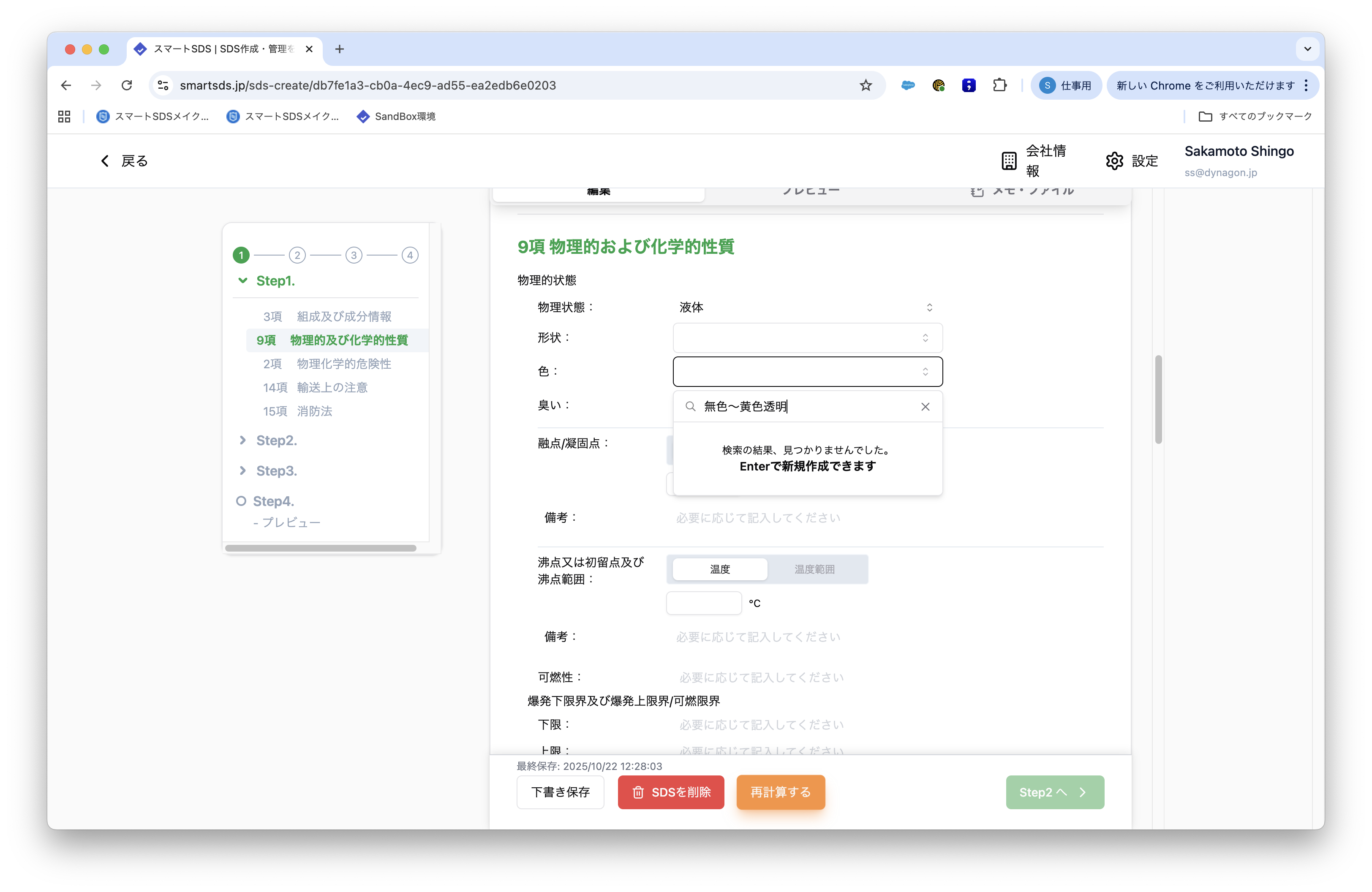 物性欄(例:色)を「無色~黄色透明」などの範囲表記で入力できる機能はありますか? 2026年03月11日 03:41 更新 ございます。1. 該当項目の入力箇所をクリックします2. 「検索または入力による追加」エリアに希望の文言を入力3. Enterボタンを押すと希望の文言が反映されるなお、色に限らず、形状・臭い等も同様の方法で入力することができます。 関連記事 濃度または濃度範囲を非公開に設定することは可能ですか? GHS分類の原則通り、スマートSDSでも急性毒性がない成分(例:水)は除外して計算されますか? SDS作成の途中で、誤ってデータを削除・上書きした場合に「元に戻す」ための復元機能はありますか? 日本語SDSを英語化する場合、どのような手順で進めればよいですか? SDS作成時に、自動判定された規制区分(毒劇法など)が「非該当」になる場合の確認・修正方法が知りたい